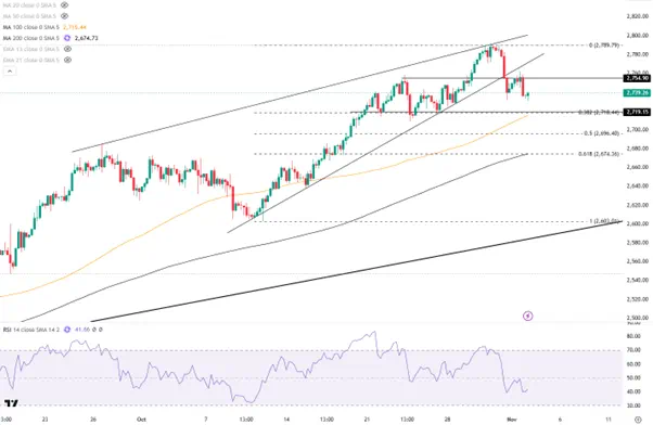 黄金在非农行情中反弹至2762后再次回落,在跌破上升楔形后金价或继续面临调整压力。下方关注2720一线的支撑,跌破后或下探至2700以及2685一线。