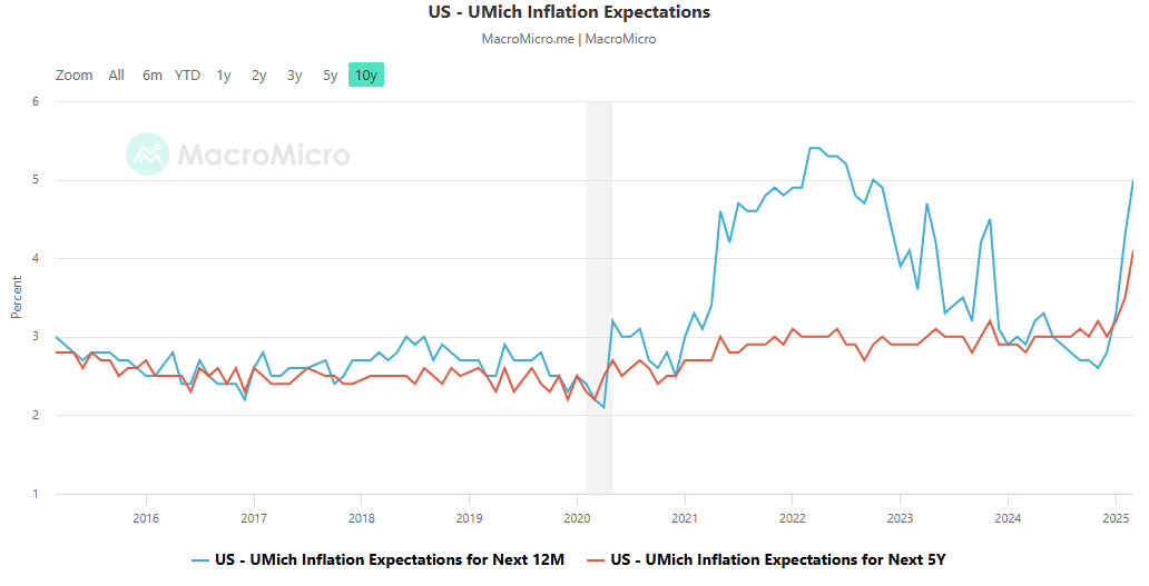 与此同时,数据显示美国2月核心PCE维持在2.5%,但密歇根大学的1年期通胀预期从4.9%上调至5%,5-10年的通胀预期从3.9上调至4.1%(下图),而消费者信心则降至2022年以来最低水平。