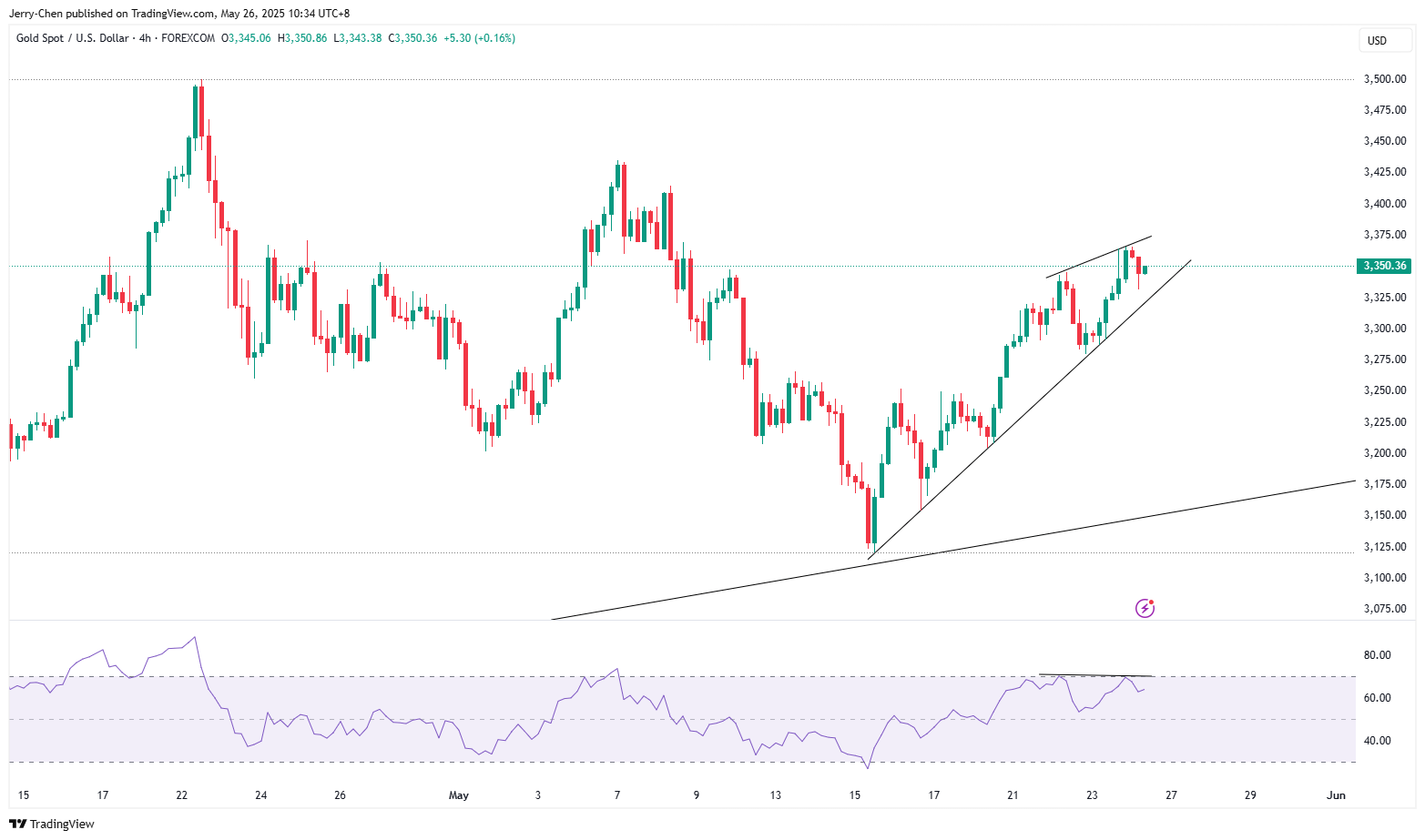 4小时图形上看,上行趋势线在3325-3330附近提供了支撑,在此基础上金价有望挑战上周高点3365一线,当前RSI指标小幅背离或许很难带来实质性的反转,尤其是如果本周当美债拍卖需求不佳可能再度引起市场担忧。若能突破3365,多头目标上移至前高3435。