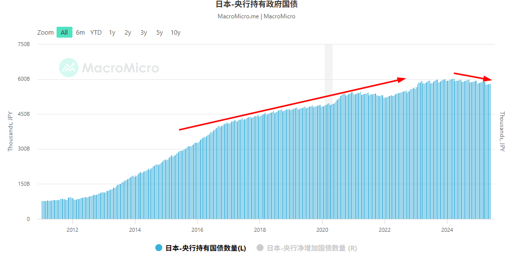 但自从2024年结束量化宽松和YCC之后,日本央行所有持有的日本国债仓位就从峰值回落。在失去了最大买家之后,国债价格下跌,收益率一路上涨,推动日元升值的同时也拉高了借贷成本,而且金融机构所持有的债券票面价值下跌出现浮亏。